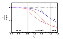 Dispersion of gravity waves on a fluid surface. Phase and group velocity divided by gh as a function of h/λ. A: phase velocity, B: group velocity, C: phase and group velocity gh valid in shallow water. Drawn lines: based on dispersion relation valid in arbitrary depth. Dashed lines: based on dispersion relation valid in deep water.