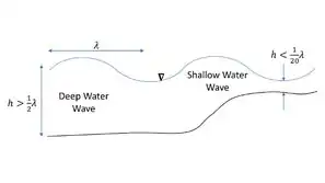 • shallow water – for a water depth smaller than 5% of the wavelength, h < 1/20λ, the phase speed of the waves is only dependent on water depth, and no longer a function of period or wavelength;[10] and