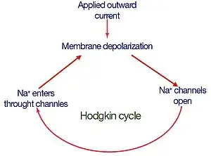 The cell membrane depolarisation sequence where a small depolarization leads to an increase in sodium permeability, which leads to influx of sodium ions, which in turn depolarizes the membrane even more[51] is now known as the Hodgkin cycle.[52]