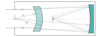 In August 1940[8] Albert Bouwers built a prototype for a design for a wide field concentric meniscus telescope[8] (patented February 1941) similar to, and slightly predating, Russian optician Dmitri Dmitrievich Maksutov's 1941 Maksutov telescope.[2][3] War time secrecy kept Bouwers and Maksutov from knowing about each other's designs[9] and Bouwers' design was not published until after World War II.[10] Bouwers original design (based on an earlier catadioptric telescope, Bernhard Schmidt's "Schmidt camera")[2] had the spherical mirror and spherical "meniscus corrector shell" all with a common radius of curvature (a concentric or monocentric design) resulting in a perfectly spherical symmetry of the whole optical device. Like the Schmidt camera, the meniscus telescope has the aperture stop coincide with the center of curvature. It also shares the Schmidt's curved image plane. The design has an ultrawide field of view with no spherical aberration but does not correct chromatic aberration and was only suitable as a monochromatic astronomical astrographic camera working at a single wavelength of light.[1][2] Bouwers came up with a later design that used a cemented doublet to form the meniscus corrector shell to correct chromatic aberration.[11]