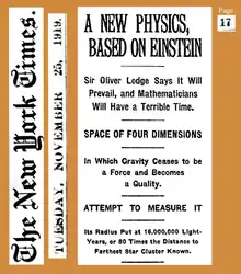 In 1907, Einstein reached a milestone on his long journey from his special theory of relativity to a new idea of gravitation with the formulation of his equivalence principle, which asserts that an observer in an infinitesimally small box falling freely in a gravitational field would be unable to find any evidence that the field exists. In 1911, he used the principle to estimate the amount by which a ray of light from a distant star would be bent by the gravitational pull of the Sun as it passed close to the Sun's photosphere (that is, the Sun's apparent surface). He reworked his calculation in 1913, having now found a way to model gravitation with the Riemann curvature tensor of a non-Euclidean four-dimensional spacetime. By the fall of 1915, his reimagining of the mathematics of gravitation in terms of Riemannian geometry was complete, and he applied his new theory not just to the behavior of the Sun as a gravitational lens but also to another astronomical phenomenon, the precession of the perihelion of Mercury (a slow drift in the point in Mercury's elliptical orbit at which it approaches the Sun most closely).[50][100] A total eclipse of the Sun that took place on 29 May 1919 provided an opportunity to put his theory of gravitational lensing to the test, and observations performed by Sir Arthur Eddington yielded results that were consistent with his calculations. Eddington's work was reported at length in newspapers around the world. On 7 November 1919, for example, the leading British newspaper, The Times, printed a banner headline that read: "Revolution in Science – New Theory of the Universe – Newtonian Ideas Overthrown".[101]