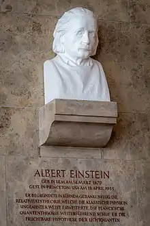 Albert Einstein (/ˈaɪnstaɪn/ EYEN-styne;[4] German: [ˈalbɛɐt ˈʔaɪnʃtaɪn] ⓘ; 14 March 1879 – 18 April 1955) was a German-born theoretical physicist who is widely held to be one of the greatest and most influential scientists of all time. Best known for developing the theory of relativity, Einstein also made important contributions to quantum mechanics, and was thus a central figure in the revolutionary reshaping of the scientific understanding of nature that modern physics accomplished in the first decades of the twentieth century.[1][5] His mass–energy equivalence formula E = mc2, which arises from relativity theory, has been called "the world's most famous equation".[6] He received the 1921 Nobel Prize in Physics "for his services to theoretical physics, and especially for his discovery of the law of the photoelectric effect",[7] a pivotal step in the development of quantum theory. His work is also known for its influence on the philosophy of science.[8][9]