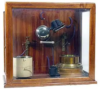 Popov also read an 1894 article about British physicist Oliver Lodge's experiments related to the discovery of radio waves by German physicist Heinrich Hertz 6 years earlier.[6] On 1 June 1894, after the death of Hertz, British physicist Oliver Lodge gave a memorial lecture on Hertz experiments. He set up a demonstration on the quasi optical nature of Hertzian waves (radio waves) and demonstrated their transmission at distances up to 50 meters.[7] Lodge used a detector called a coherer, a glass tube containing metal filings between two electrodes.[4] When received waves from an antenna were applied to the electrodes, the coherer became conductive allowing the current from a battery to pass through it, with the impulse being picked up by a mirror galvanometer. After receiving a signal, the metal filings in the coherer had to be reset by a manually operated vibrator or by the vibrations of a bell placed on the table nearby that rang every time a transmission was received.[7] Popov set to work to design a more sensitive radio wave receiver that could be used as a lightning detector, to warn of thunderstorms by detecting the electromagnetic pulses of lightning strikes[1] using a coherer receiver.[1][2]