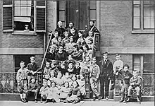 Unsure of his future, he contemplated returning to London to complete his studies, but decided to return to Boston as a teacher.[61] His father helped him set up his private practice by contacting Gardiner Greene Hubbard, the president of the Clarke School for the Deaf for a recommendation. Teaching his father's system, in October 1872, Alexander Bell opened his "School of Vocal Physiology and Mechanics of Speech" in Boston, which attracted a large number of deaf pupils, with his first class numbering 30 students.[62][63] While he was working as a private tutor, one of his pupils was Helen Keller, who came to him as a young child unable to see, hear, or speak. She was later to say that Bell dedicated his life to the penetration of that "inhuman silence which separates and estranges".[64] In 1893, Keller performed the sod-breaking ceremony for the construction of Bell's new Volta Bureau, dedicated to "the increase and diffusion of knowledge relating to the deaf".[65][66]