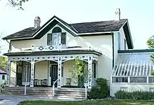 In 1870, 23-year-old Bell travelled with his parents and his brother's widow, Caroline Margaret Ottaway,[46] to Paris, Ontario,[47] to stay with Thomas Henderson, a Baptist minister and family friend.[48] The Bell family soon purchased a farm of 10.5 acres (4.2 ha) at Tutelo Heights (now called Tutela Heights), near Brantford, Ontario. The property consisted of an orchard, large farmhouse, stable, pigsty, hen-house, and a carriage house, which bordered the Grand River.[49][N 7]