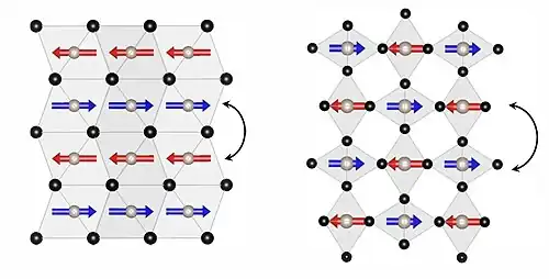 Atoms with opposite magnetic moment are in altermagnets coupled by crystal rotation or mirror symmetry.[1][5][6][7][8][9] The spatial orientation of magnetic atoms may originate from the surrounding cages of non-magnetic atoms.[7][11] The opposite spin sublattices in altermagnetic manganese telluride (MnTe) are related by spin rotation combined with six-fold crystal rotation and half-unit cell translation.[7][8] In altermagnetic ruthenium dioxide (RuO2), the opposite spin sublattices are related by four-fold crystal rotation.[7][9]