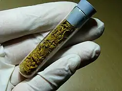 Ammonium diuranate or (ADU) ((NH4)2U2O7), is one of the intermediate chemical forms of uranium produced during yellowcake production. The name "yellowcake" originally given to this bright yellow salt, now applies to mixtures of uranium oxides which are actually hardly ever yellow. It also is an intermediate in mixed-oxide (MOX) fuel fabrication. Although it is usually called "ammonium diuranate" as though it has a "diuranate" ion U