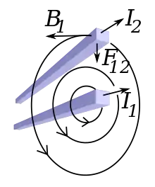 Two current-carrying wires attract each other magnetically: The bottom wire has current I1, which creates magnetic field B1. The top wire carries a current I2 through the magnetic field B1, so (by the Lorentz force) the wire experiences a force F12. (Not shown is the simultaneous process where the top wire makes a magnetic field which results in a force on the bottom wire.)