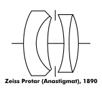 The first Anastigmat was designed by Paul Rudolph for the German firm Carl Zeiss AG in 1890 and marketed as the Protar;[1]: 65–66(§103) it consisted of four elements in two groups, as an asymmetric arrangement of two cemented achromatic lens doublets and was improved to a five-element, two-group design in 1891, substituting a cemented triplet for the rear group.[2]: 82–83