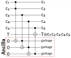 A trivial use for ancilla bits is downgrading complicated quantum gates into simple gates. For example, by placing controls on ancilla bits, a Toffoli gate can be used as a controlled NOT gate or a NOT gate.[1]: 29