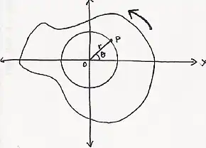 In the example illustrated to the right (or above in some mobile versions), a particle or body P is at a fixed distance r from the origin, O, rotating counterclockwise. It becomes important to then represent the position of particle P in terms of its polar coordinates (r, θ). In this particular example, the value of θ is changing, while the value of the radius remains the same. (In rectangular coordinates (x, y) both x and y vary with time.) As the particle moves along the circle, it travels an arc length s, which becomes related to the angular position through the relationship: