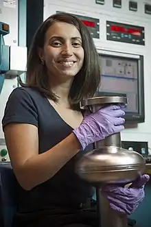 She is known for her pioneering work in superconducting radio frequency cavities for next generation particle accelerators.[1][12] As a postdoc, Grassellino experimented with introducing a small amount of nitrogen into the inner surface of the cavities, which are made of niobium and surface treated using electropolishing.[13][14] She and her group noticed that residual nitrogen remaining in the cavity systematically improved the RF superconductivity response.[4][15] By baking the niobium SRF cavities at high temperatures in the presence of nitrogen, the Q factors more than tripled; dramatically reducing the cryogenic costs of the large accelerator facilities.[13][16] She made the discovery of nitrogen doping by accident, hoping to create niobium nitride but instead found with her FNAL group – via material and surface science studies – that the real effect was due to nitrogen as interstitial.[16] Superconducting radio frequency cavities generate high energy with high current and expel magnetic flux, which can result in power dissipation.[17] The technology has been adopted as the standard for SRF cavities and used in laboratories all over the world, as well as private firms.[4][18] The LCLS-II HE upgrades at SLAC are the first world class accelerator facilities to be built entirely with the nitrogen doping technology. In 2015 she was awarded a $2.5 million Early Career Award from the United States Department of Energy, which allowed her to employ postdocs.[4]
