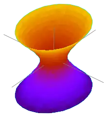 where is a nonzero constant with dimensions of length (the radius of curvature). This is a (generalized) sphere in the sense that it is a collection of points for which the "distance" (determined by the quadratic form) from the origin is constant, but visually it is a hyperboloid, as in the image shown.