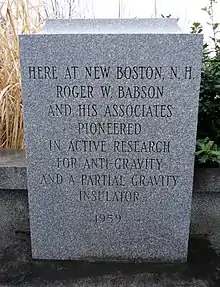 In 1948 businessman Roger Babson (founder of Babson College) formed the Gravity Research Foundation to study ways to reduce the effects of gravity.[12] Their efforts were initially somewhat "crankish", but they held occasional conferences that drew such people as Clarence Birdseye, known for his frozen-food products, and helicopter pioneer Igor Sikorsky. Over time the Foundation turned its attention away from trying to control gravity, to simply better understanding it. The Foundation nearly disappeared after Babson's death in 1967. However, it continues to run an essay award, offering prizes of up to $4,000. As of 2017, it is still administered out of Wellesley, Massachusetts, by George Rideout Jr., son of the foundation's original director.[13] Winners include California astrophysicist George F. Smoot (1993), who later won the 2006 Nobel Prize in physics, and Gerard 't Hooft (2015) who previously won the 1999 Nobel Prize in physics.[14]
