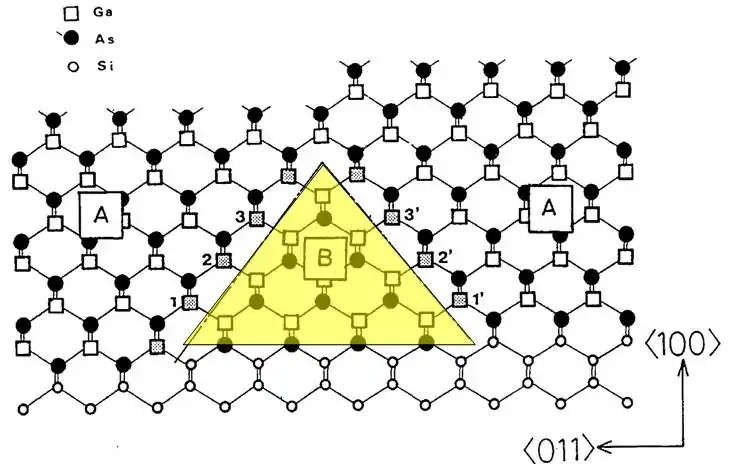 The shaded region, B, is an example of an APD. In the figure, GaAs is grown on a misoriented surface of Si (details are not discussed here). The misorientation causes the Ga and As atoms in region B to be on opposite sites compared to the crystal matrix. The presence of the APD results in Ga sites 1, 1’, 2, 2’, 3, 3’ being bonded to Ga atoms in the APD to form an APB.