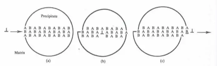 Figure 3: The process of an edge dislocation moving through an ordered precipitate. In (a), the perfectly ordered particle is shown. In (b), the dislocations has moved through part of the particle. In (c), the dislocation exits the precipitate, leading to an increase in surface energy from increased surface area and a higher-energy bonding configuration.[1]
