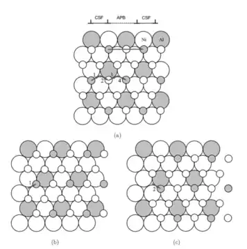 Antiphase domains carry with them a surface energy penalty when compared to the perfect lattice due to their chemical disorder, and the presence of these boundaries impedes dislocation motion throughout the crystal, leading to increased strength under shear stress. Figure 3 below shows the process of an edge dislocation propagating through an ordered particle. As the dislocation moves throughout the particle, lattice planes are displaced from their equilibrium configuration, and A-A bonds and B-B bonds are formed throughout the slip plane. This forms a higher energy state than when compared to the equilibrium A-B bonding configuration, and the change in energy is called the anti-phase boundary energy (APBE). This can increase the degree of strengthening created from precipitation hardening, making it more difficult for cutting to occur, and instead increasing the likelihood of Orowan bowing around the precipitate.[1]