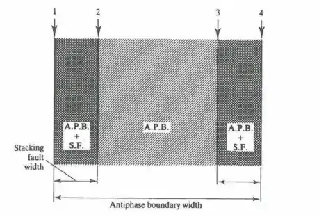 These planar defects are similar to stacking faults in that they are often created through slip of atomic planes and dislocation motion, but the degree of translation varies. In stacking faults, the region of stacking mismatch is bounded by two partial dislocations, and an extended dislocation is formed. For anti-phase domains which only exhibit chemical disorder, the region is bounded by two complex stacking faults, which exhibit both stacking and chemical disorder.[1] Thus, it takes 4 partial dislocations to fully restore the order of the crystal. These can be seen in Figure 1 and 2 below. The width of these regions is determined by the force balance between the like-signed partial dislocations’ repulsion and the regions surface energy. As the anti-phase boundary surface energy increases, the degree of separation between the partial dislocations will decrease to compensate.