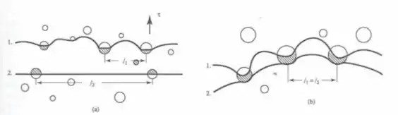 Order strengthening is often characterized by a ratio of the attractive anti-phase boundary energy (APBE) to the repulsive dislocation energy(Gb): . The degree of order strengthening depends on both this ratio and whether the alloy is in the early or late stages of precipitation. When is low, the trailing dislocation moves far behind the leading dislocations, leading to separate cutting of precipitates as seen in Figure 4a. Alternatively, when is high, the trailing dislocation follows close behind the leading dislocation, leading to common cutting as seen in Figure 4b. During the early stages of precipitation, the increase in shear stress can be expressed as: