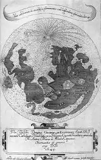 Schyrleus also included a map of the Moon in Oculus Enoch et Eliae. It was the first depiction of the Moon as seen in an inverting telescope (and thus the Moon itself is inverted in the illustration, with the South Pole at the top). The crater Tycho, for example, was depicted on lunar maps as early as 1645, when Schyrleus depicted the bright ray system. His map, however, did not come into standard use, as it was superseded by those made by Hevelius and the Jesuits Giovanni Battista Riccioli and Francesco Maria Grimaldi (1650–1651). In 1647, Schyrleus published a lunar chart with a diameter of 19 cm.