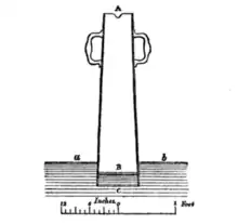 A very convenient size for the instrument represented in the above figure, is to make the length AC, 3 feet, and the mouth A, where the face is applied, of an irregular oval form, that both eyes may see freely into the tube, with an indentation on one side, that the nose may breathe freely, not throwing the moisture of the breath into the tube. B is a round plate of glass, 8 inches diameter, over which is the rim or edge C ; this rim is best formed of lead, J of an inch thick, and 3 inches deep; the weight of the lead serves to sink the tube a little into the water. Holes must be provided at the junction of B to C, for the purpose of allowing the air to escape, and bring the water into contact with the glass; on each side there is a handle for holding the instrument.[8]