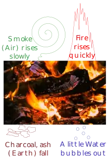 Natural motion depends on the element concerned: the aether naturally moves in a circle around the heavens,[upper-alpha 9] while the 4 Empedoclean elements move vertically up (like fire, as is observed) or down (like earth) towards their natural resting places.[45][43][upper-alpha 10]