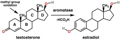 Aromatases are enzymes that aromatize rings within steroids. The specific conversions are testosterone to estradiol and androstenedione to estrone.[4] Each of these aromatizations involves the oxidation of the C-19 methyl group to allow for the elimination of formic acid concomitant with aromatization. Such conversions are relevant to estrogen tumorogenesis in the development of breast cancer and ovarian cancer in postmenopausal women and gynecomastia in men.[5] Aromatase inhibitors like exemestane (which forms a permanent and deactivating bond with the aromatase enzyme)[6] and anastrozole and letrozole (which compete for the enzyme)[7] have been shown to be more effective than anti-estrogen medications such as tamoxifen likely because they prevent the formation of estradiol.[5]