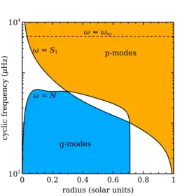 This basic separation allows us to determine (to reasonable accuracy) where we expect what kind of mode to resonate in a star. By plotting the curves and (for given ), we expect p-modes to resonate at frequencies below both curves or frequencies above both curves.