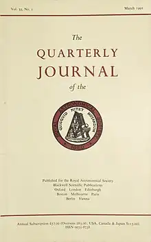 The Quarterly Journal of the Royal Astronomical Society (Q. J. R. Astron. Soc, ISSN 0035-8738) was published by the Royal Astronomical Society from September 1960 to December 1996, and was produced by Blackwell Science in its later period. During that time 37 volumes were issued. The journal included articles reviewing modern astronomy or geophysics, discussions about research topics, meeting reports, contributions about the history of science, and reports of astronomical research groups and institutes. It gave less emphasis to detailed scientific research papers, which instead were published in the society's Monthly Notices. (ISSN 0308-3322).[8][9][10]