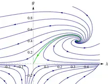 QEG flow diagram for the Einstein–Hilbert truncation. Arrows point from UV to IR scales. Dark background color indicates a region of fast flow, in regions of light background the flow is slow or even zero. The latter case includes a vicinity of the Gaussian fixed point in the origin, and the NGFP in the center of the spiralling arrows, respectively. The cross-over trajectory tangent to the green arrows connects the non-Gaussian to the Gaussian fixed point and plays the role of a separatrix.