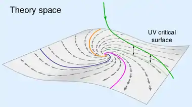 Trajectories of the renormalization group flow in theory space, parametrized by infinitely many coupling constants. By convention, the arrows of the vector field (and the one on the green trajectory) point from UV to IR scales. The set of actions which lie inside the theory space and are pulled into the fixed point under the inverse RG flow (i.e., going in the direction opposite to the arrows) is referred to as UV critical surface. The asymptotic safety hypothesis is that a trajectory can only be realized in Nature if it is contained in the UV critical surface since only then it has a well-behaved high energy limit (orange, blue, and magenta trajectories, by way of example). Trajectories outside this surface escape theory space for since they develop unacceptable divergences in the UV, while going to lower scales they approach the UV critical surface. This situation is represented by the green trajectory which lies above the surface and runs away from it for increasing RG scale (opposite to the green arrow).