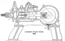 The 1887 patent (US 367496) describes the mechanical linkages necessary to obtain all four strokes of the four-stroke cycle for a gas engine within one revolution of the crankshaft.[1] There is also a reference to an 1886 Atkinson patent (US 336505), which describes an opposed-piston gas engine.[7] The British patent for the "Utilite'" is from 1892 (#2492).