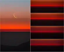 Young[6][11] distinguished several regions where different methods for calculating astronomical refraction were applicable. In the upper portion of the sky, with a zenith distance of less than 70° (or an altitude over 20°), various simple refraction formulas based on the index of refraction (and hence on the temperature, pressure, and humidity) at the observer are adequate. Between 20° and 5° of the horizon the temperature gradient becomes the dominant factor and numerical integration, using a method such as that of Auer and Standish[12] and employing the temperature gradient of the standard atmosphere and the measured conditions at the observer, is required. Closer to the horizon, actual measurements of the changes with height of the local temperature gradient need to be employed in the numerical integration. Below the astronomical horizon, refraction is so variable that only crude estimates of astronomical refraction can be made; for example, the observed time of sunrise or sunset can vary by several minutes from day to day. As The Nautical Almanac notes, "the actual values of …the refraction at low altitudes may, in extreme atmospheric conditions, differ considerably from the mean values used in the tables."[13]