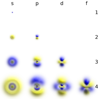 Electrons, like other particles, have properties of both a particle and a wave. The electron cloud is a region inside the potential well where each electron forms a type of three-dimensional standing wave—a wave form that does not move relative to the nucleus. This behavior is defined by an atomic orbital, a mathematical function that characterises the probability that an electron appears to be at a particular location when its position is measured.[43] Only a discrete (or quantized) set of these orbitals exist around the nucleus, as other possible wave patterns rapidly decay into a more stable form.[44] Orbitals can have one or more ring or node structures, and differ from each other in size, shape and orientation.[45]