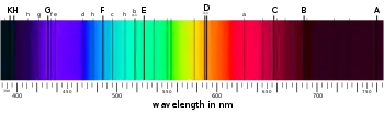The energy of an emitted photon is proportional to its frequency, so these specific energy levels appear as distinct bands in the electromagnetic spectrum.[81] Each element has a characteristic spectrum that can depend on the nuclear charge, subshells filled by electrons, the electromagnetic interactions between the electrons and other factors.[82]