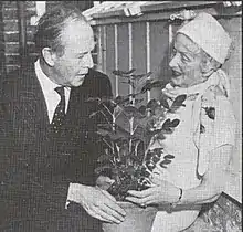 In 1960, Howorth published a book entitled "Atomic Gardening for the Layman" along a similar theme.[8] The Atomic Gardening Society utilized an early form of crowd-sourcing, in which members received irradiated seeds, planted them in their gardens, and sent reports back to Howorth detailing the results.[9] Howorth herself made national news upon growing a two-foot-tall peanut plant after planting an irradiated nut.[9] The youngest member of the society was Christopher Abbey (15), a student at Eastbourne College and the son of a dentist, who received a certificate of merit for propagating several species of irradiated seeds to maturity. Irradiated seeds were sold to the public by C.J. Speas, a Tennessee dentist who had obtained a license for a cobalt-60 source; and sold seeds produced in a backyard cinderblock bunker. Speas did so upon seeing an opportunity for amateur gardeners to get involved in testing.[10] Howorth, in an effort to give the members of her society a broader selection, began ordering seeds from Speas in large quantities. By 1960, Speas had reportedly shipped Howorth over three and a half million seeds, which were then distributed to nearly a thousand individual Society members.[9]