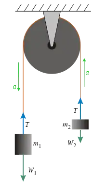 The ideal Atwood machine consists of two objects of mass m1 and m2, connected by an inextensible massless string over an ideal massless pulley.[1]