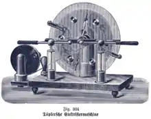 Toepler’s electrostatic machines were made by different people and companies, e.g. a Toepler machine can be found in a Welch Scientific Company (Chicago, USA) catalog. The differences between a Toepler machine, a Holtz machine, and a Toepler-Holtz machine are unclear even in books written when they were vital, modern technology. Sometimes such a machine is called a Holtz-Toepler machine simply because it was made by Holtz, but the original design is still the same as the Toepler machine.