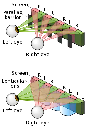 ![]() Comparison of parallax-barrier and lenticular autostereoscopic displays. Note: The figure is not to scale. | |