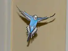 Small birds often fly long distances using a technique in which short bursts of flapping are alternated with intervals in which the wings are folded against the body. This is a flight pattern known as "bounding" or "flap-bounding" flight.[6] When the bird's wings are folded, its trajectory is primarily ballistic, with a small amount of body lift.[2] The flight pattern is believed to decrease the energy required by reducing the aerodynamic drag during the ballistic part of the trajectory,[7] and to increase the efficiency of muscle use.[8][9]