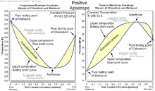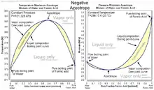 The adjacent diagram illustrates total vapor pressure of three hypothetical mixtures of constituents, X, and Y. The temperature throughout the plot is assumed to be constant. The center trace is a straight line, which is what Raoult's law predicts for an ideal mixture. In general solely mixtures of chemically similar solvents, such as n-hexane with n-heptane, form nearly ideal mixtures that come close to obeying Raoult's law. The top trace illustrates a nonideal mixture that has a positive deviation from Raoult's law, where the total combined vapor pressure of constituents, X and Y, is greater than what is predicted by Raoult's law. The top trace deviates sufficiently that there is a point on the curve where its tangent is horizontal. Whenever a mixture has a positive deviation and has a point at which the tangent is horizontal, the composition at that point is a positive azeotrope.[17] At that point the total vapor pressure is at a maximum. Likewise the bottom trace illustrates a nonideal mixture that has a negative deviation from Raoult's law, and at the composition where tangent to the trace is horizontal there is a negative azeotrope. This is also the point where total vapor pressure is minimum.[17]