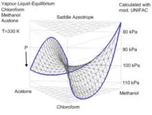 Some azeotropes fit into neither the positive nor negative categories. The best known of these is the ternary azeotrope formed by 30% acetone, 47% chloroform, and 23% methanol, which boils at 57.5 °C. Each pair of these constituents forms a binary azeotrope, but chloroform/methanol and acetone/methanol both form positive azeotropes while chloroform/acetone forms a negative azeotrope. The resulting ternary azeotrope is neither positive nor negative. Its boiling point falls between the boiling points of acetone and chloroform, so it is neither a maximum nor a minimum boiling point. This type of system is called a saddle azeotrope.[8] Only systems of three or more constituents can form saddle azeotropes.
