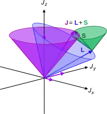 "Vector cones" of total angular momentum J (purple), orbital L (blue), and spin S (green). The cones arise due to quantum uncertainty between measuring angular momentum component.