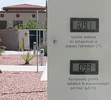 The weather station outside of the Atomic Testing Museum on a hot summer day. Displayed background gamma radiation level is 9.8 μR/h (0.82 mSv/a) This is very close to the world average background radiation of 0.87 mSv/a from cosmic and terrestrial sources.