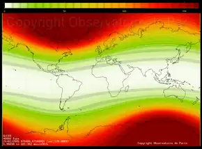 Estimate of the maximum dose of radiation received at an altitude of 12 km 20 January 2005, following a violent solar flare. The doses are expressed in microsieverts per hour.