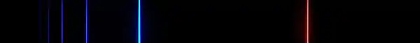The visible spectrum of light from hydrogen displays four wavelengths, 410 nm, 434 nm, 486 nm, and 656 nm, that correspond to emissions of photons by electrons in excited states transitioning to the quantum level described by the principal quantum number n equals 2.[1] There are several prominent ultraviolet Balmer lines with wavelengths shorter than 400 nm. The series continues with an infinite number of lines whose wavelengths asymptotically approach the limit of 364.5 nm in the ultraviolet.