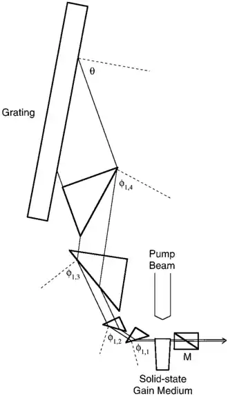 Multiple-prism beam expanders usually deploy two to five prisms to yield large one-dimensional beam expansion factors. Designs applicable to tunable lasers with beam expansion factors of up to 200 have been disclosed in the literature.[3] Initially multiple-prism grating configurations were introduced in narrow-linewidth liquid dye lasers[1][7] but eventually were also adopted in gas, solid-state, and diode laser designs.[3] The generalized mathematical description of multiple-prism beam expanders, introduced by Duarte,[8] is known as the multiple-prism dispersion theory.[1][3]