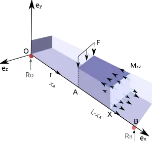 In the beam shown in the adjacent figure, the external forces are the applied force at point A () and the reactions at the two support points O and B ( and ). For this situation, the only non-zero component of the bending moment is