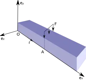 An important part of determining bending moments in practical problems is the computation of moments of force. Let be a force vector acting at a point A in a body. The moment of this force about a reference point (O) is defined as[2]