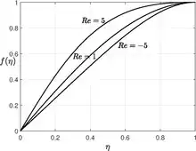 This third order nonlinear ordinary differential equation requires three boundary condition and the fourth boundary condition is to determine the constant . and this equation is found to possess multiple solutions.[4][5] The figure shows the numerical solution for low Reynolds number, solving the equation for large Reynolds number is not a trivial computation.